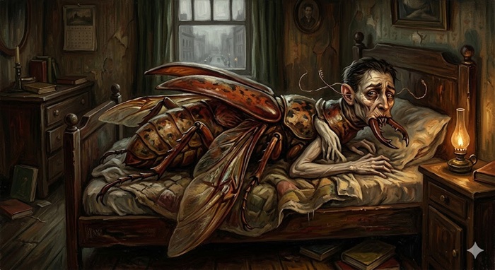 格里高尔·萨姆沙原本是一名旅行推销员,长期为家庭承担经济来源。一天清晨,他从不安的梦中醒来,发现自己已经变成了一只巨大的甲虫。他躺在床上,身体僵硬,背部隆起,四肢细长而难以控制。他尝试翻身起床,却反复失败,只能在床上无力地挣扎。